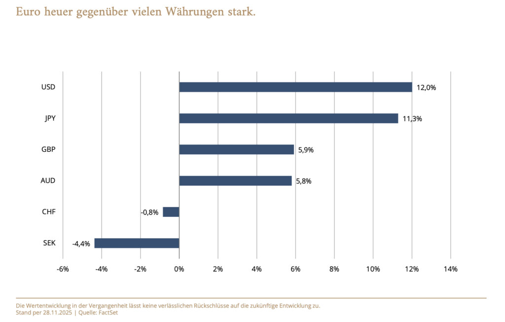 Der Euro hat in diesem Jahr gegenüber vielen Währungen an Wert gewonnen. Am deutlichsten fiel die Aufwertung gegenüber dem US-Dollar aus. Der Euro legte um 12,0 Prozent zu, was aus Sicht eines Euro-Investors die Performance von US-Werten spürbar schmälerte.