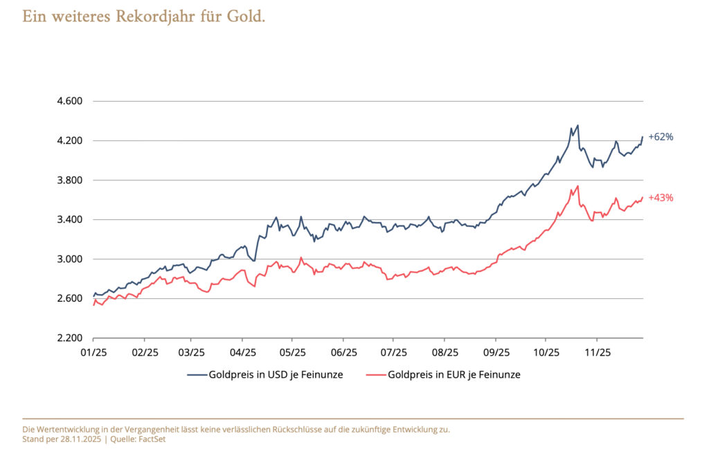 Das Edelmetall Gold legte ein weiteres Rekordjahr hin – sowohl in US-Dollar als auch in Euro. Zeitweise eilte der Preis für das Edelmetall wieder von einem Rekordhoch zum anderen. Per Ende November ist der Goldpreis in Dollar um über 62 Prozent und in Euro um über 43 Prozent gestiegen.
