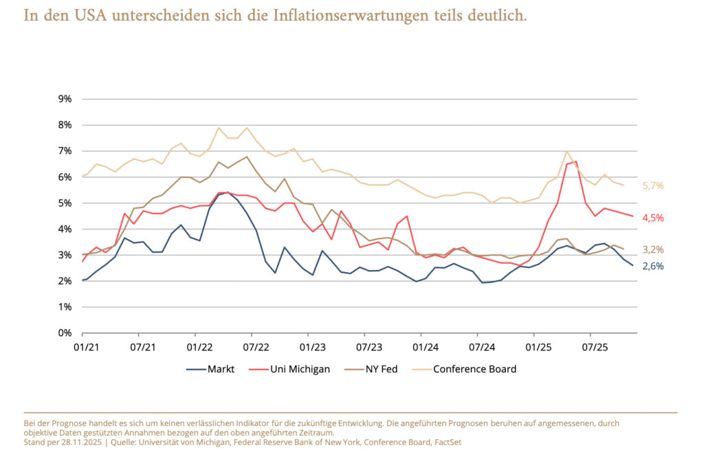 Während die Inflation in der Eurozone fast das Zielniveau der EZB von zwei Prozent erreicht hat, liegt sie in den USA mit 3,0 Prozent noch deutlich darüber. Auch die Erwartungen für die nächsten 12 Monate zeigen keine nennenswerte Besserung. Die Inflationserwartungen verschiedener Institute unterscheiden sich teils deutlich und reichen von 2,6 Prozent bei den Marktteilnehmer:innen bis zu 5,7 Prozent beim Conference Board.