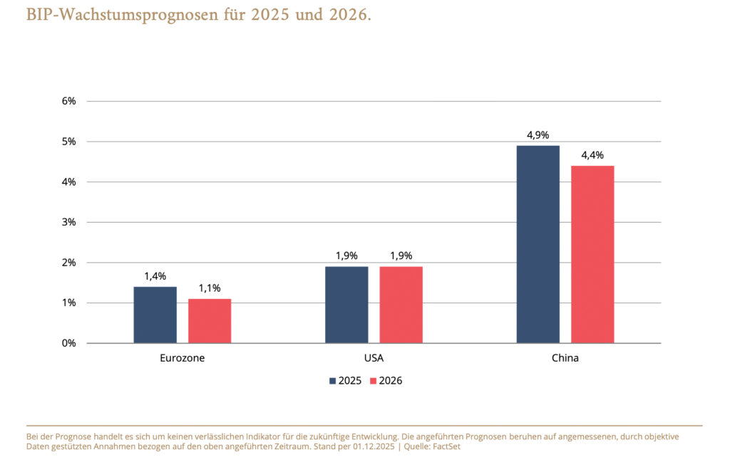 An den Aktienmärkten war 2025 ein erfreuliches Jahr. Per Ende November hatten chinesische Aktien mit einem Plus von 15,9 Prozent die Nase vorn. Europäische Aktien legten um 13,6 Prozent zu, während US-Aktien ein Plus von 3,9 Prozent verzeichneten.