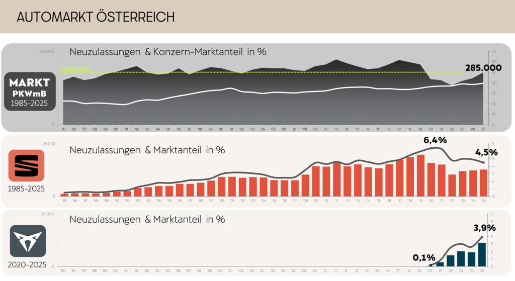 Die Challenger Brand, hat im Autojahr 2025 mit 11.219 Fahrzeugen einen Neuzulassungsrekord sowie mit 3,9% einen Marktanteilsrekord verzeichnet: Österreich ist damit weltweit der erfolgreichste internationale CUPRA-Markt.