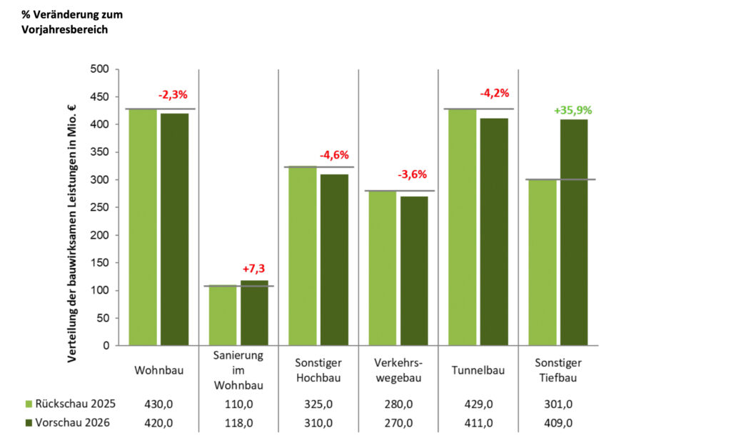 Erfreulich entwickelt sich auch die Sanierung im Wohnbau: Nach dem drastischen Einbruch im Vorjahr steigen die prognostizierten Leistungen um 7,3 % auf 118 Millionen Euro – ein klares Signal, dass das Segment wieder Fahrt aufnimmt.