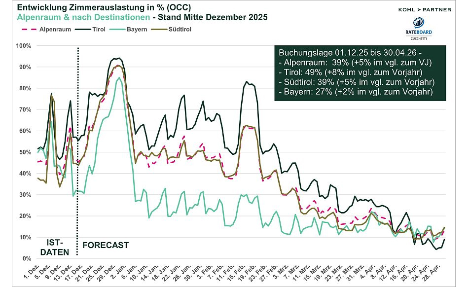 Innerhalb des Alpenraums zeigen sich deutliche Unterschiede: Tirol erreicht mit einer Auslastung von 49 % den höchsten aktuellen Wert und verzeichnet mit +8 % auch den stärksten Zuwachs gegenüber dem Vorjahr. Südtirol verbessert sich auf 39 % Auslastung (+4,9 %) und liegt damit im Mittelfeld des Alpenraums.