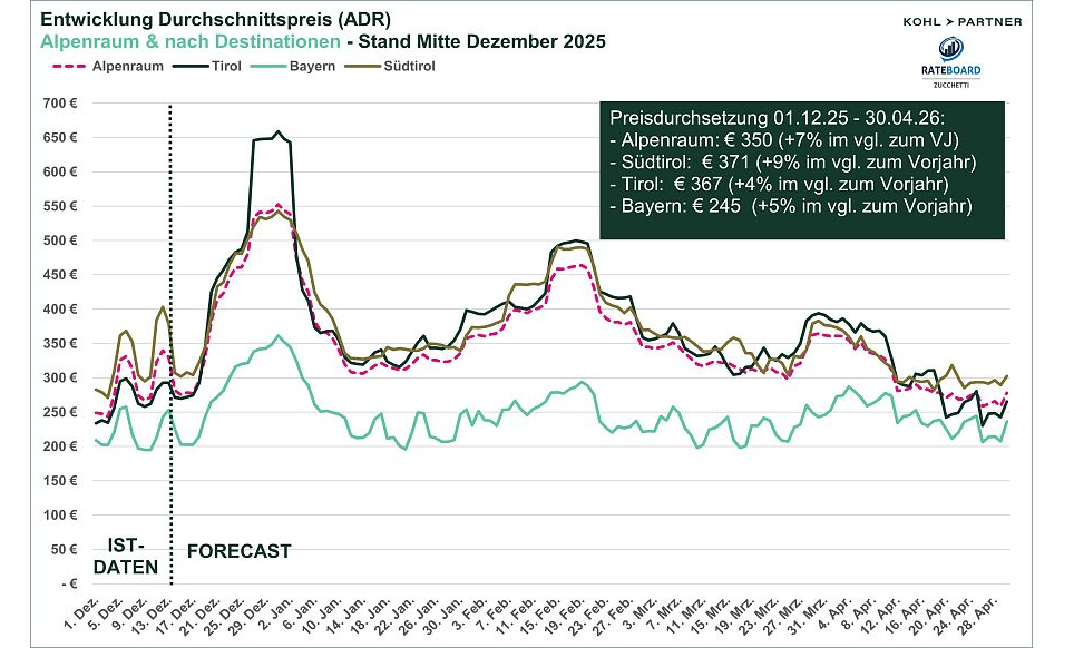 Südtirol bestätigt seine Position als Preisführer mit einem durchschnittlichen ADR von € 371 (+9 %). Neben der grundsätzlich starken Marktposition dürfte hier auch die internationale Aufmerksamkeit im Zusammenhang mit den Olympischen Winterspielen 2026 in Mailand–Cortina eine Rolle spielen. Tirol erreicht einen durchschnittlichen Zimmerpreis von € 367 (+4 %).