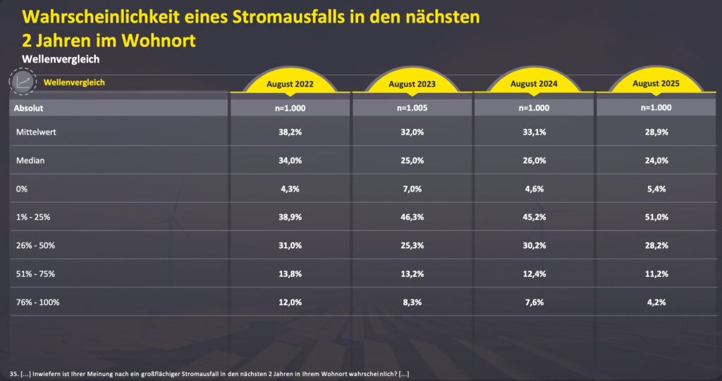 Parallel dazu ist die Anzahl der Menschen, die tatsächlich sicher von einem großflächigen Stromausfall in den nächsten zwei Jahren ausgehen, deutlich gesunken: Waren es 2024 noch ungefähr acht Prozent, die meinten, ein großflächiger Stromausfall in den nächsten zwei Jahren wäre zu 76 bis 100 Prozent wahrscheinlich, so sind es 2025 nur mehr halb so viel Menschen, nämlich etwas mehr als vier Prozent.