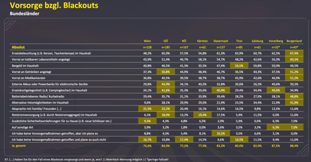 Die Blackout-Vorsorge scheint ein Thema zu sein, das in den letzten Jahren immer unwichtiger wurde: Acht von zehn Österreicher:innen sorgen zwar, wie schon in den Vorjahren, insbesondere mit einfachen Haushaltsmaßnahmen vor, aber die Maßnahmen sind für den Ernstfall nicht ausreichend. Außerdem ist ein Fünftel der Haushalte nicht einmal rudimentär vorbereitet.