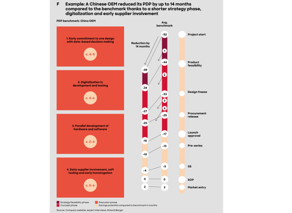 Ein konkretes Fallbeispiel aus der Automobilindustrie zeigt: Ein chinesischer Hersteller von Personenfahrzeugen (OEM) konnte seine Entwicklungszeit um 14 Monate im Vergleich zum globalen Referenzwert reduzieren, hauptsächlich durch organisatorische und prozessuale Anpassungen, ohne Abstriche bei Marktfähigkeit oder Produktreife.