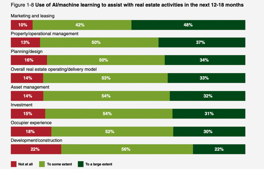 In den kommenden 18 Monaten soll KI in Bereichen wie Vermietung (90 %), Objektmanagement (87 %), Planung (84 %) und Asset Management (86 %) zum Einsatz kommen.