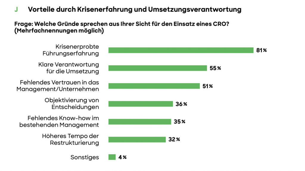 Als Hauptvorteil nennen 81 Prozent, dass der CRO krisenerprobte Führungserfahrung ins Unternehmen bringt und damit das Wissen, welche Schritte in der Ausnahmesituation einer Restrukturierung wann und wie anzugehen sind.