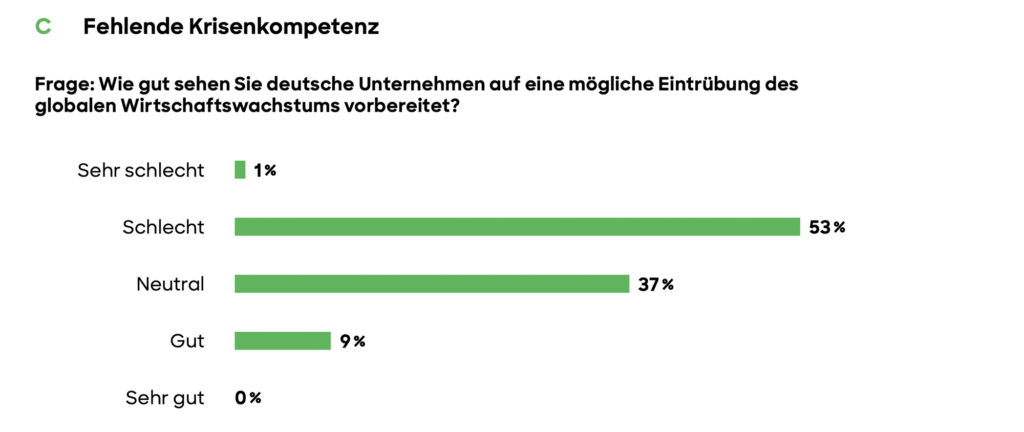 Eigene Krisenkompetenz fehlt den meisten Unternehmen. Vor dem Hintergrund der Vielzahl von Herausforderungen und der mit Nicht-Handeln verbundenen Risiken stimmt bedenklich, dass 53 Prozent der befragten Experten die deutschen Unternehmen schlecht für eine mögliche weitere konjunkturelle Eintrübung gerüstet sehen.