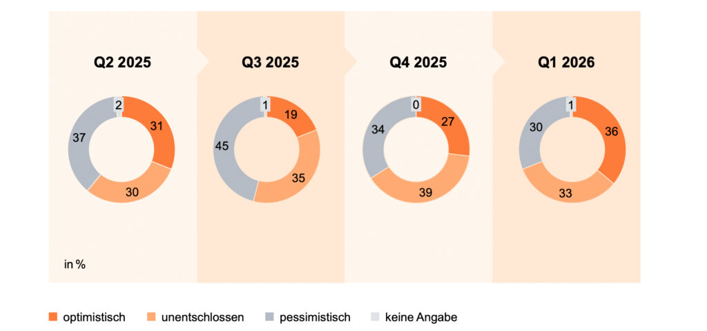 Auch der Blick auf die Weltwirtschaft fällt etwas zuversichtlicher aus: 36 % der Befragten sind hier optimistisch gestimmt, 30 % pessimistisch (im Vorquartal lagen diese Werte bei 27 % beziehungsweise 34 %).