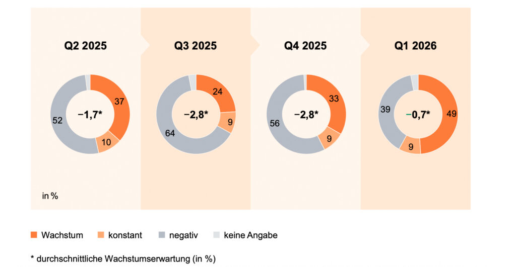 Für die Gesamtbranche erwarten die Befragten im Schnitt ein Umsatzrückgang von –0,7 %. Im Vorquartal lag die Prognose allerdings noch bei –2,8 %. Fast jeder zweite Befragte rechnet inzwischen mit Wachstum, im Vorquartal war es nur jeder Dritte.