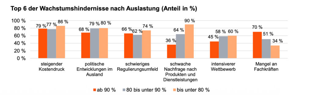 Auch die schwache Nachfrage bleibt mit 64 % ein zentrales Thema. Der Fachkräftemangel fällt dagegen mit 51 % auf den niedrigsten Wert seit 2018. Gleichzeitig nimmt der Wettbewerbsdruck zu und wird inzwischen von 55 % der Befragten als Wachstumshindernis genannt.