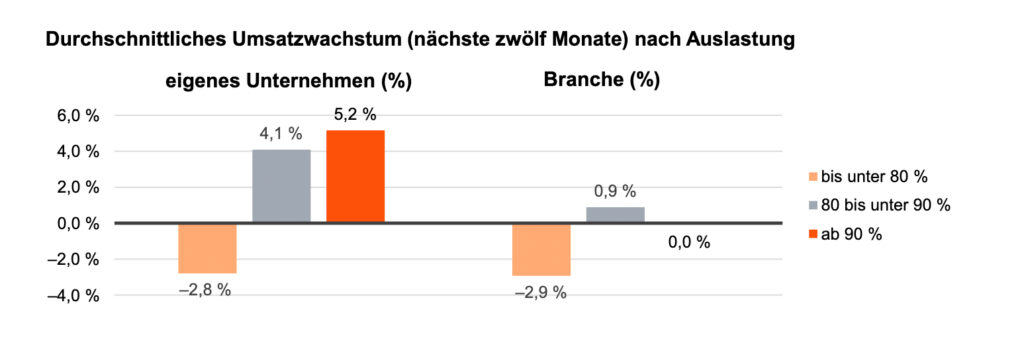Wie optimistisch die Befragten auf das eigene Unternehmen blicken, hängt dabei stark von der aktuellen Kapazitätsauslastung ab: Befragte Unternehmen mit einer aktuellen Auslastung von mindestens 90 % erwarten im Schnitt +5,2 % Umsatzwachstum, bei denjenigen mit unter 80 % sind es –2,8 %.