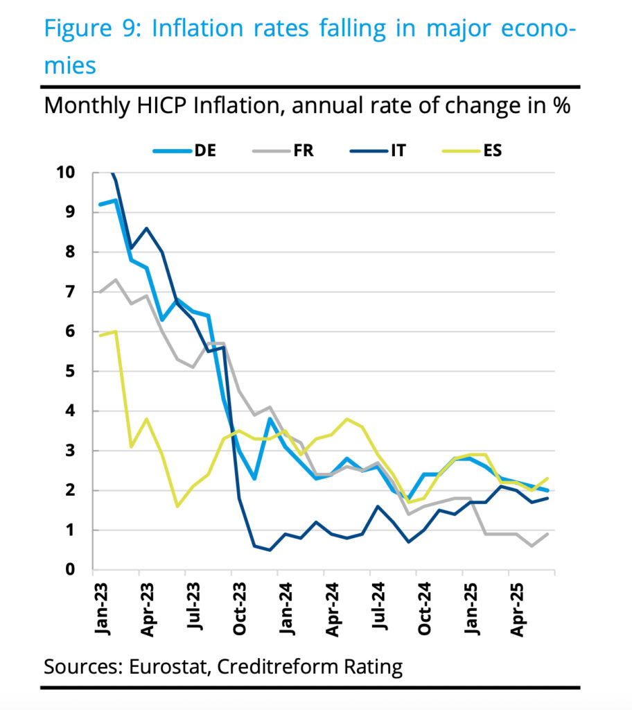 Die Gesamtinflation im Euroraum nähert sich mit einem erwarteten Stand von 2,0 Prozent Mitte 2025 dem Ziel der Europäischen Zentralbank (EZB). Der Inflationsdruck bleibt jedoch hoch, getrieben durch Lohnsteigerungen und nach wie vor hohe Dienstleistungspreise. Im Juni senkte die EZB ihren Einlagesatz auf 2,0 Prozent und sollte bis Jahresende eine weitere Reduktion auf 1,75 Prozent vornehmen.