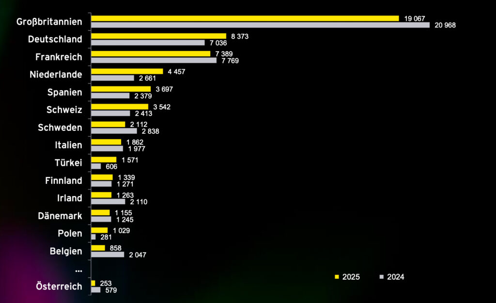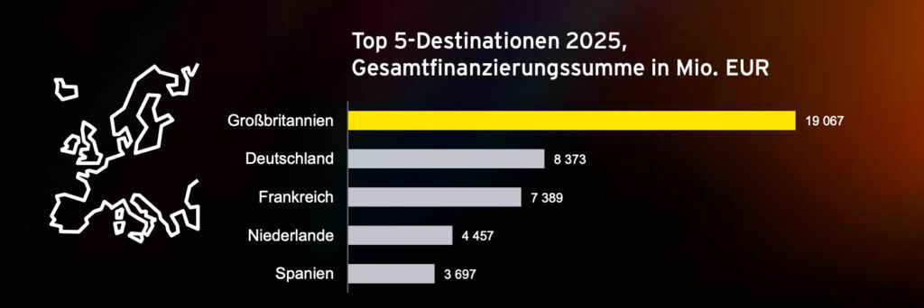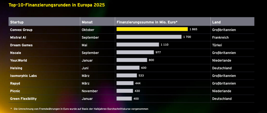 Auch die größte Finanzierungsrunde des Jahres fand in Großbritannien statt: Die Convex Group sammelte rund 1,9 Milliarden Euro ein, das französische KI-Vorzeigeunternehmen Mistral AI erhielt 1,7 Milliarden Euro, das türkische Gaming-Unternehmen Dream Games 1,1 Milliarden Euro. Nscale in London erreichte 977 Millionen Euro, während Your.World in den Niederlanden rund 800 Millionen Euro erhielt.