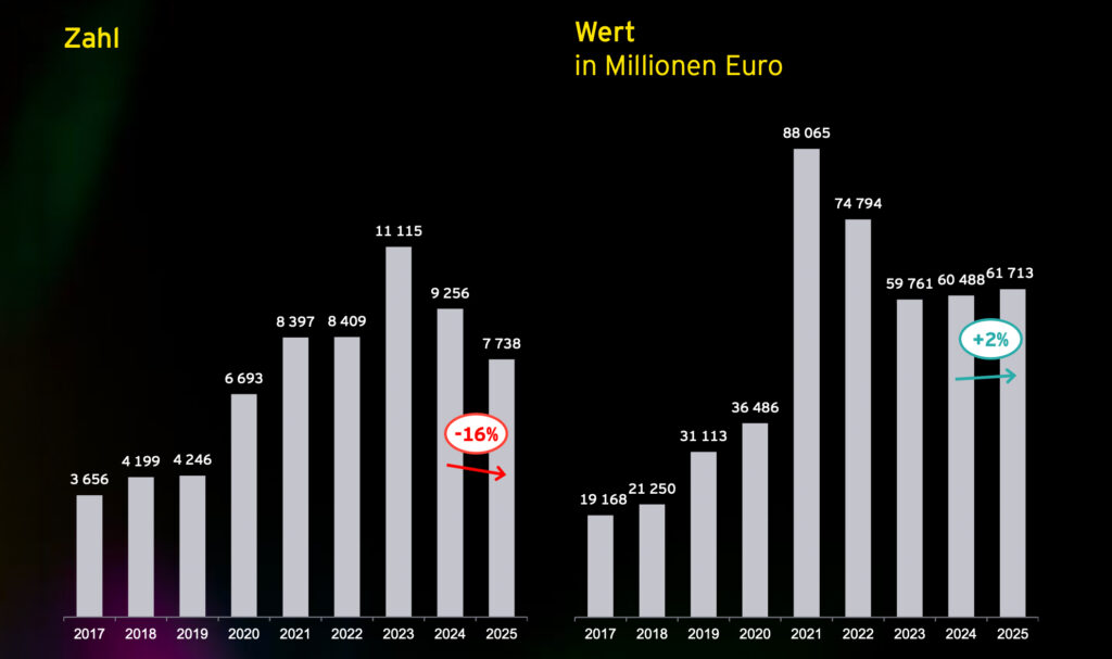 Einen deutlichen Rückgang gab es hingegen bei der Anzahl der Finanzierungsrunden. Diese erreichte 2025 mit 7.738 Abschlüssen nur den fünfthöchsten Wert im Untersuchungszeitraum der letzten neun Jahre und verzeichnete im zweiten Jahr in Folge einen Rückgang. Gegenüber 2024, als europaweit noch 9.256 Abschlüsse gezählt wurden, entspricht dies einem Minus von rund 16 Prozent.