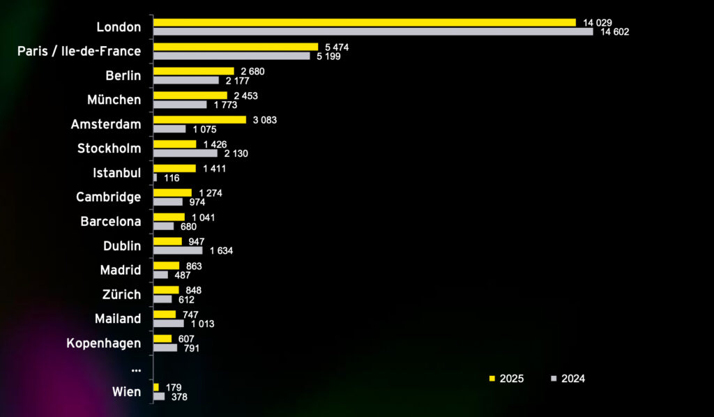 London bleibt 2025 unangefochtener Spitzenreiter: Mit 1.304 Finanzierungsrunden wurden dort fast so viele Deals gezählt wie in Deutschland und Frankreich zusammen, trotz eines leichten Rückgangs gegenüber dem Vorjahr. Dahinter rangiert das Île-de-France-Ökosystem mit 347 Runden, gefolgt von Berlin mit 218 Abschlüssen. Auch Amsterdam, Barcelona, Stockholm und Dublin bleiben zentrale Hotspots, die hohe Abschlusszahlen mit wachsender Kapitaltiefe verbinden.