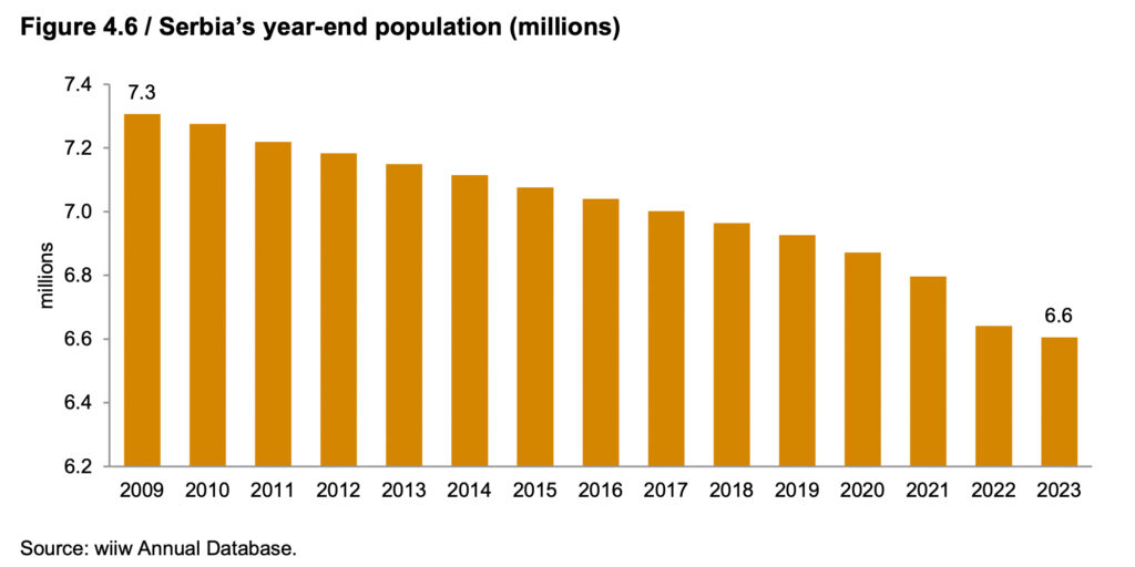 Ein besonderes Problem stellt auch in Serbien der starke Bevölkerungsrückgang aufgrund von Migration in die EU und niedrigerer Geburtenraten dar. So schrumpfte die Einwohnerzahl in Serbien zwischen 2009 und 2023 um 700.000 Personen – von 7,3 Millionen auf 6,6 Millionen. Daraus könnte sehr bald ein ausgewachsener Arbeitskräftemangel entstehen.