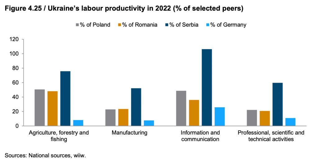 Wettbewerbsfähig ist die Ukraine bisher vor allem in der Land- und Forstwirtschaft, bei Lebensmitteln, in der Metallproduktion und im IT-Bereich. Rüstung oder Luftfahrt – Stichwort Drohnen – sind andere Beispiele und bieten großes Potenzial. Traditionell weist die Ukraine aber den geringsten Bestand an ausländischen Direktinvestitionen in der gesamten Region auf.