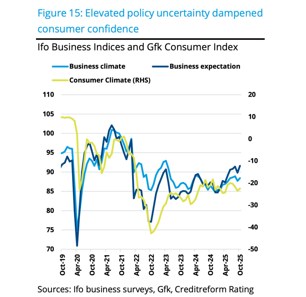 In Deutschland dürfte die Wirtschaftsleistung 2025 nur 0,2 Prozent betragen und 2026 auf rund 0,9 Prozent steigen – getragen vor allem von einer allmählichen Erholung der Binnennachfrage und einem verzögerten Investitionsimpuls aus dem neuen Infrastruktur- und Verteidigungsprogramm.