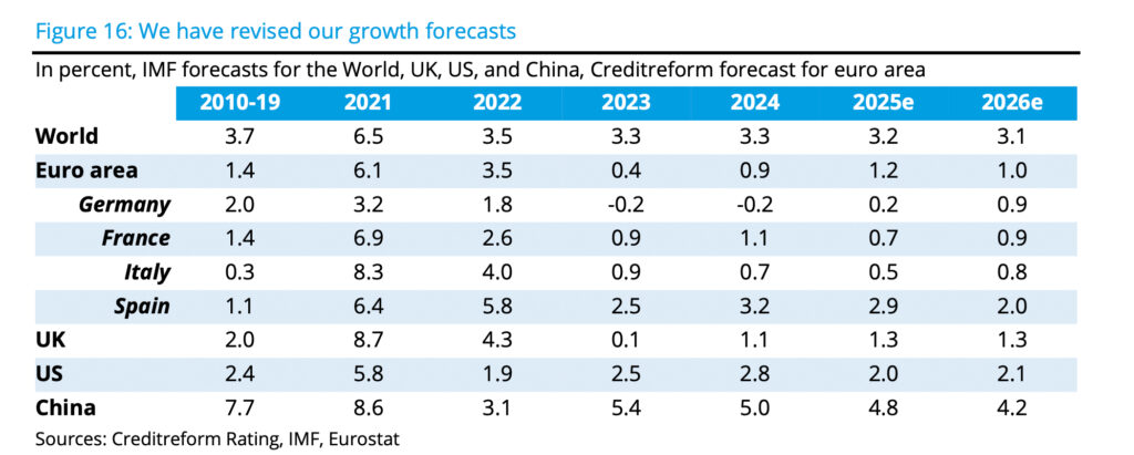 Laut der heute veröffentlichten Ausgabe der Creditreform Economic Briefs wächst das Bruttoinlandsprodukt (BIP) im Euroraum 2025 um 1,2 Prozent, bevor es 2026 auf 1,0 Prozent zurückgeht.