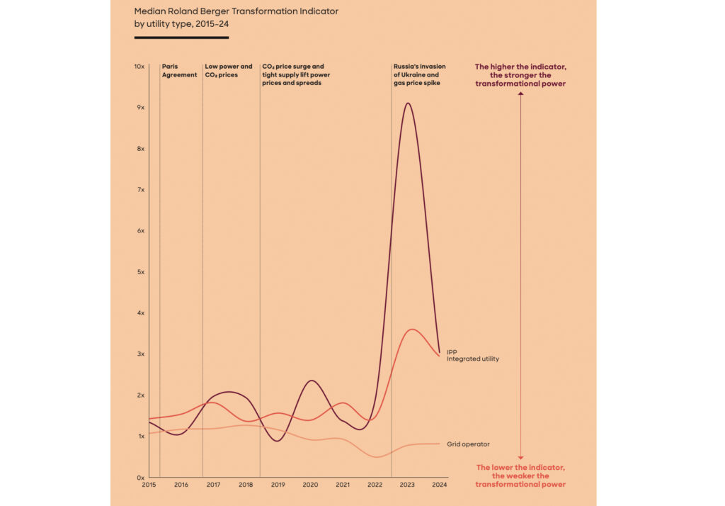 Der Roland Berger Transformations Indikator, der Rentabilität des eingesetzten Kapitals (ROCE) und Verschuldungsgrad kombiniert, offenbart ein besorgniserregendes Bild: Nur etwa 55 Prozent der führenden europäischen Versorger erfüllen die Mindestanforderungen für nachhaltige Transformationskraft.