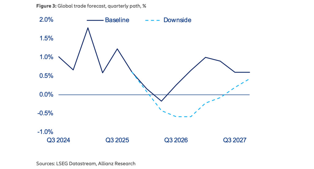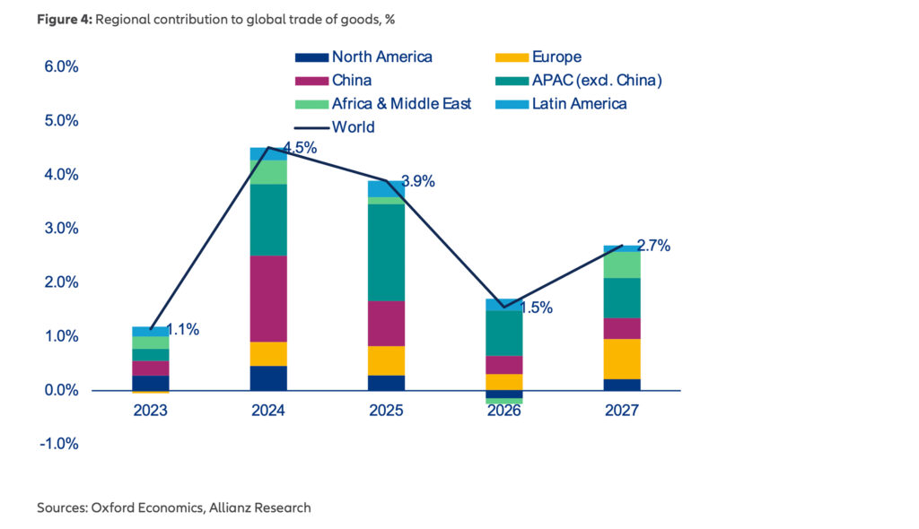 Auch der globale Warenhandel wird durch die geopolitische Lage spürbar gebremst und dürfte 2026 nur noch um +1,5 Prozent wachsen.