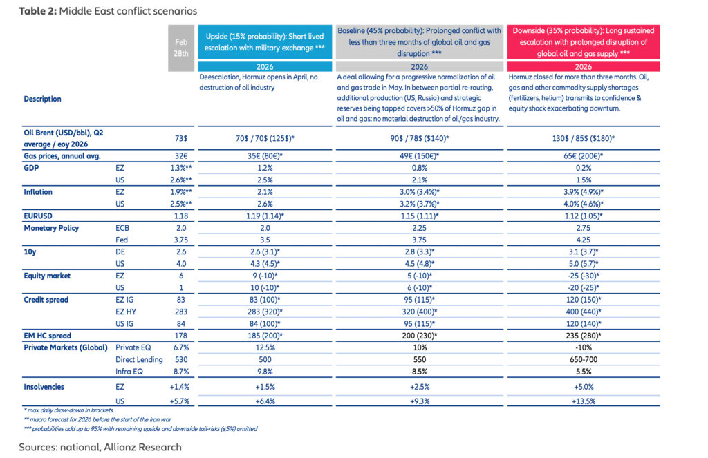Im Basisszenario wird das globale Wirtschaftswachstum 2026 nur noch bei +2,6 Prozent erwartet – um 0,5 Prozentpunkte weniger als vor der jüngsten Zuspitzung des Konflikts. Für die USA wird ein Wachstum von +2,1 Prozent, für die Eurozone nur noch von +0,8 Prozent prognostiziert.