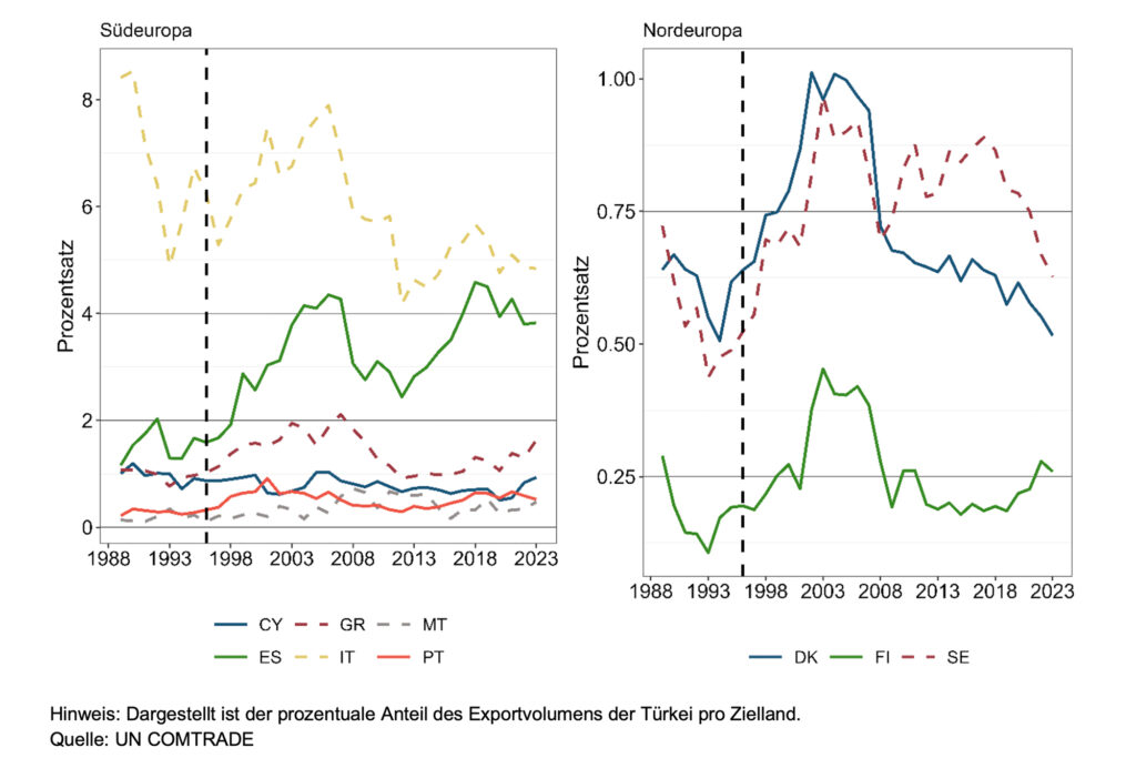 Vor allem bei einer tiefgreifenden Modernisierung der Zollunion (S3) nähmen die Handelsströme zwischen der Türkei und der EU deutlich zu, wobei die EU-Exporte (+7,1 Prozent) stärker stiegen als die türkischen (+6,2 Prozent).