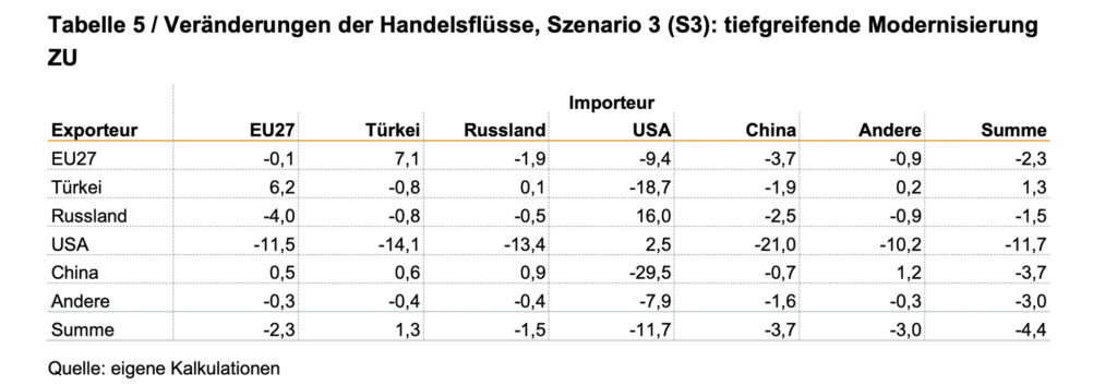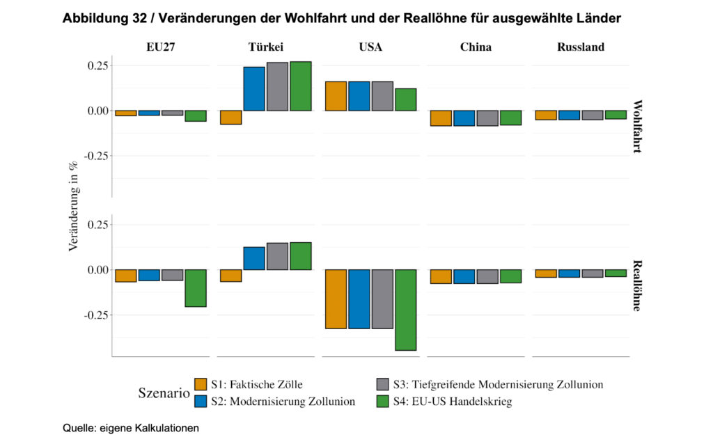 Insgesamt wäre allerdings die Türkei die Hauptnutznießerin einer vertieften Handelsbeziehung, da die Wohlstandseffekte für sie mit 0,24 bis 0,267 Prozent des BIP klar positiv wären. Die EU-Staaten profitierten von der Vertiefung der Zollunion mit der Türkei dagegen nur minimal (BIP-Plus S2 gegenüber S1: 0,002 Prozent; und BIP-Plus S3 gegenüber S2: 0,001 Prozent) und hätten insgesamt aufgrund von Trumps Zöllen leichte Wohlstandsverluste (S1 bis S3: 0,025 bis 0,028 Prozent des BIP) zu verzeichnen.