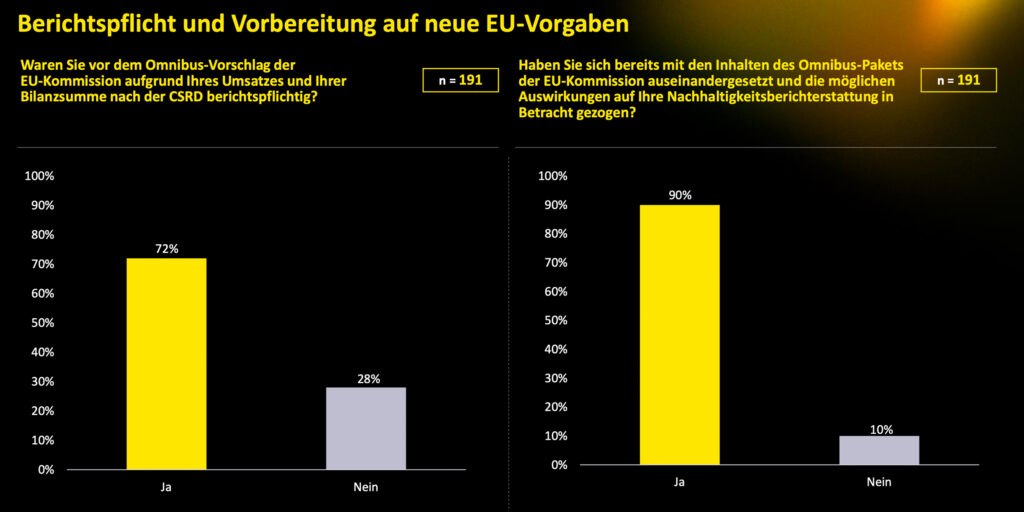 Das sind Ergebnisse einer Omnibus-Umfrage der Prüfungs- und Beratungsorganisation EY denkstatt, der Nachhaltigkeitsberatung von EY. Dafür wurden über 200 Mitarbeitende von österreichischen Unternehmen befragt. Von den teilnehmenden Unternehmen waren 72 Prozent vor dem Omnibus-Paket nach CSRD berichtspflichtig.