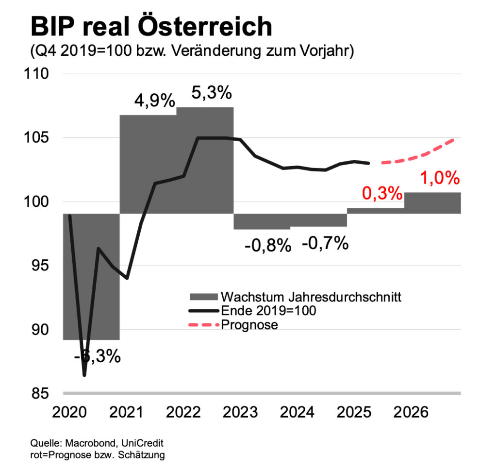 Für Österreich sieht Stefan Bruckbauer, Chefvolkswirt der UniCredit Bank Austria, „nach der Stagnation von 2025 ein heimisches Wirtschaftswachstum von 1 Prozent für das kommende Jahr 2026“.