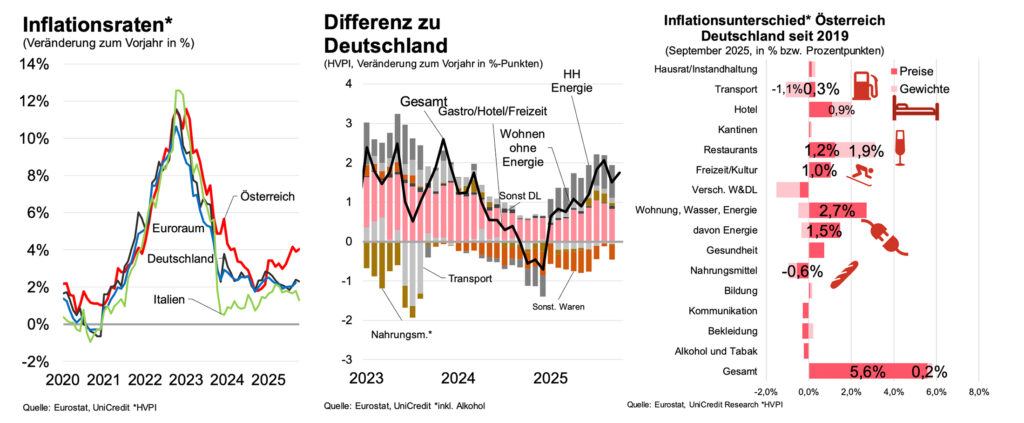 „Die Inflation ist in Österreich im Vergleich zu Deutschland und dem Euroraum deutlich höher. Hauptgründe sind Wohnungsenergie und Gastronomie und Hotellerie. Die Inflation treibt zudem die Lohnstückkosten weiter hinauf. Das verursacht einen Rückgang des Anteils der Gewinne an der Wertschöpfung in Österreich“, unterstreicht Stefan Bruckbauer und ergänzt: