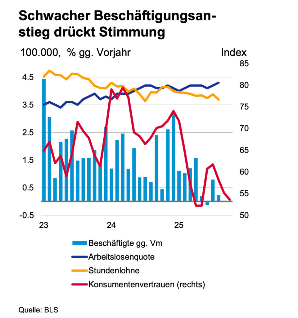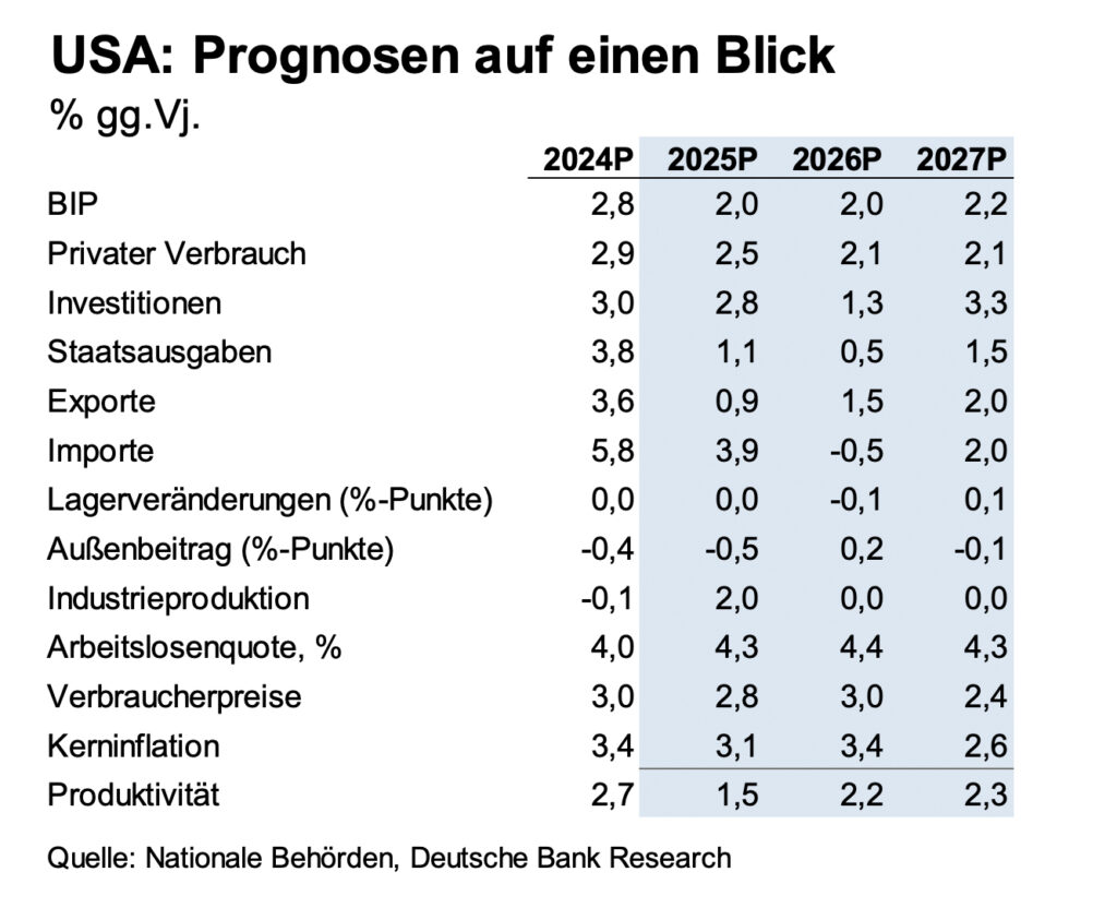 Für die USA rechnet Stefan Schneider mit einem „Wachstum auf Potenzialrate“. „Nach einem Rückgang als Reaktion auf den Handelsschock im ersten Halbjahr 2025, rechnen wir mit einem Wachstum auf und über dem Potenzial für 2026 und 2027“, betont Stefan Schneider. Zu den kurzfristigen Herausforderungen für die US-Wirtschaft zählten, so der Ökonom, „eine schwache Beschäftigung, die Unsicherheiten in der Handelspolitik und die knappen Realeinkommen“.