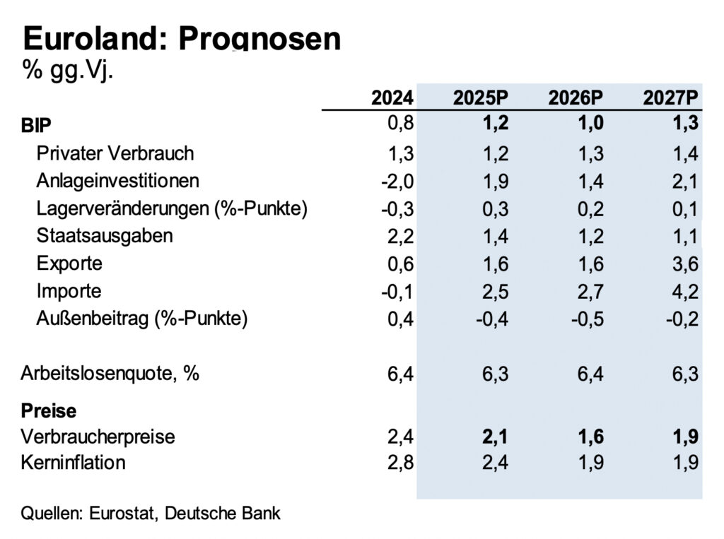 „Die Weltkonjunktur wird 2026 voraussichtlich etwas mehr Schwung bekommen, obwohl die Handelskonflikte sie weiterhin belasten“, erklärt Stefan Schneider, Senior Advisor on German and European Research Deutsche Bank, beim „Ökonomischen Ausblick“ des Bankenverbands zur aktuellen Entwicklung und führt weiter aus: „Die BIP-Prognose des Euroraums liegt bei 1,2 Prozent für 2025, obwohl das USA-EU-Handelsabkommen das BIP-Wachstum um rund einen halben Prozentpunkt reduzieren dürfte.“