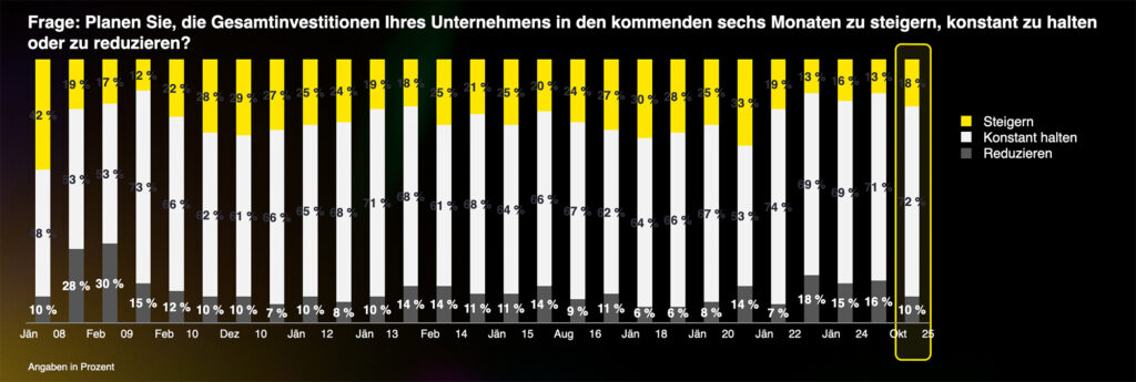 Trotz Konjunkturbedenken planen Österreichs Mittelständler zu investieren: Gut jeder Sechste (18 %) will verstärkt Investitionen tätigen, nur zehn Prozent planen, weniger zu investieren.