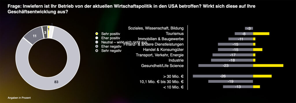 Die aktuelle Wirtschaftspolitik in den USA schlägt sich auch hierzulande teilweise nieder: Wenngleich vier von fünf Mittelständlern (83 %) keine Auswirkungen der aktuellen Wirtschaftspolitik in den USA auf den eigenen Betrieb bemerken, spüren 14 Prozent negative Effekte und lediglich drei Prozent positive.