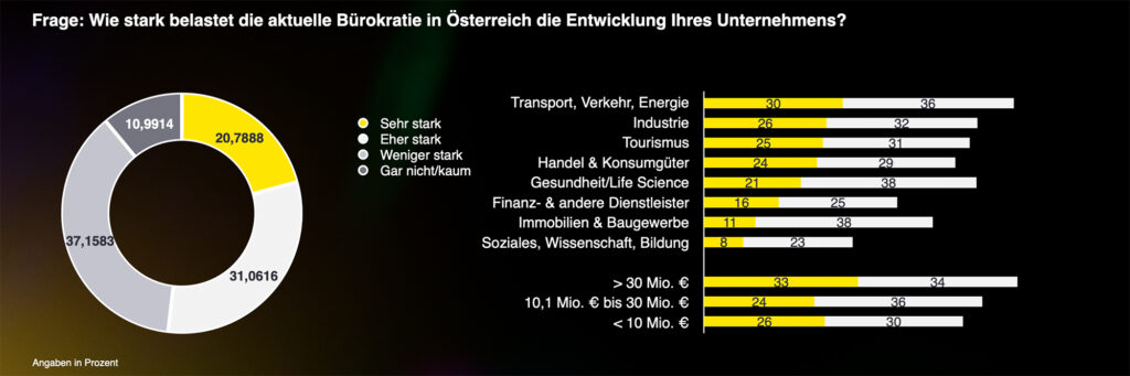 Genau wie im Vorjahr fühlen sich 52 Prozent der befragten Unternehmen durch die aktuelle Bürokratie stark in ihrer Entwicklung belastet. Am höchsten ist der Anteil der Unternehmen, die sich sehr stark belastet fühlen, mit 30 Prozent im Bereich Transport, Verkehr, Energie, gefolgt von der Industrie (26 %) und dem Tourismus (25 %). Größere Unternehmen mit Jahresumsätzen von mehr als 30 Millionen Euro fühlen sich häufiger sehr stark belastet als kleinere Unternehmen (33 vs. 26 %).