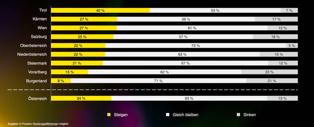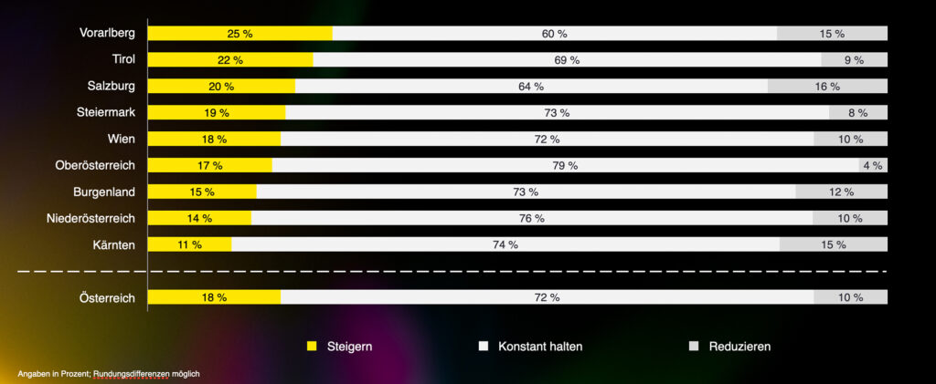 Auch bei den Investitionsbestrebungen ist es zu einem Wechsel auf den Stockerlplätzen gekommen: Vorarlberg (25 %) sowie Tirol (22 %) und Salzburg (20 %) planen die stärksten Investitionen, im Vorjahr führte Wien (16 %) das Ranking an.