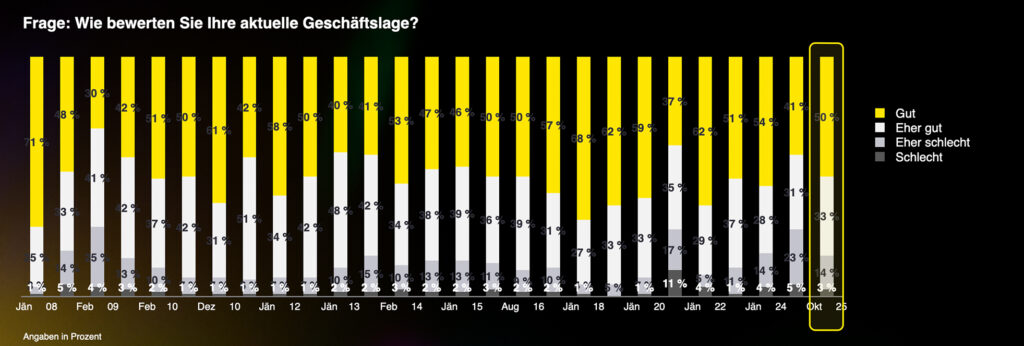 Die aktuelle Geschäftslage wird in Tirol von sechs von zehn (61 %) Unternehmen als gut eingeschätzt, gefolgt von Wien und Niederösterreich (je 53 %). Im vergangenen Jahr belegte Salzburg den zweiten Platz mit 60 Prozent und ist heuer auf Platz 4 abgerutscht (49 %). Das Schlusslicht bildet 2025 das Burgenland, wo nur 41 Prozent die Geschäftslage positiv bewerten; 2024 belegte Niederösterreich mit nur 25 Prozent das Schlusslicht.