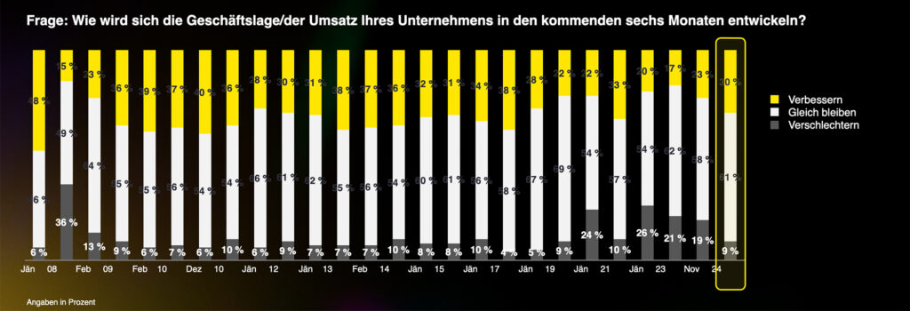 Der Blick in die Zukunft ist ebenfalls positiv: 30 Prozent rechnen mit einer Verbesserung der eigenen Geschäftslage, nur neun Prozent mit einer Eintrübung – im Vorjahr waren es mehr als doppelt so viele (19 %).