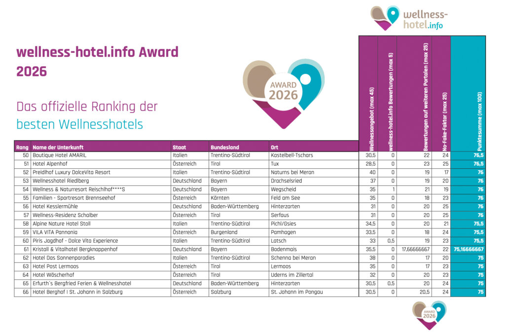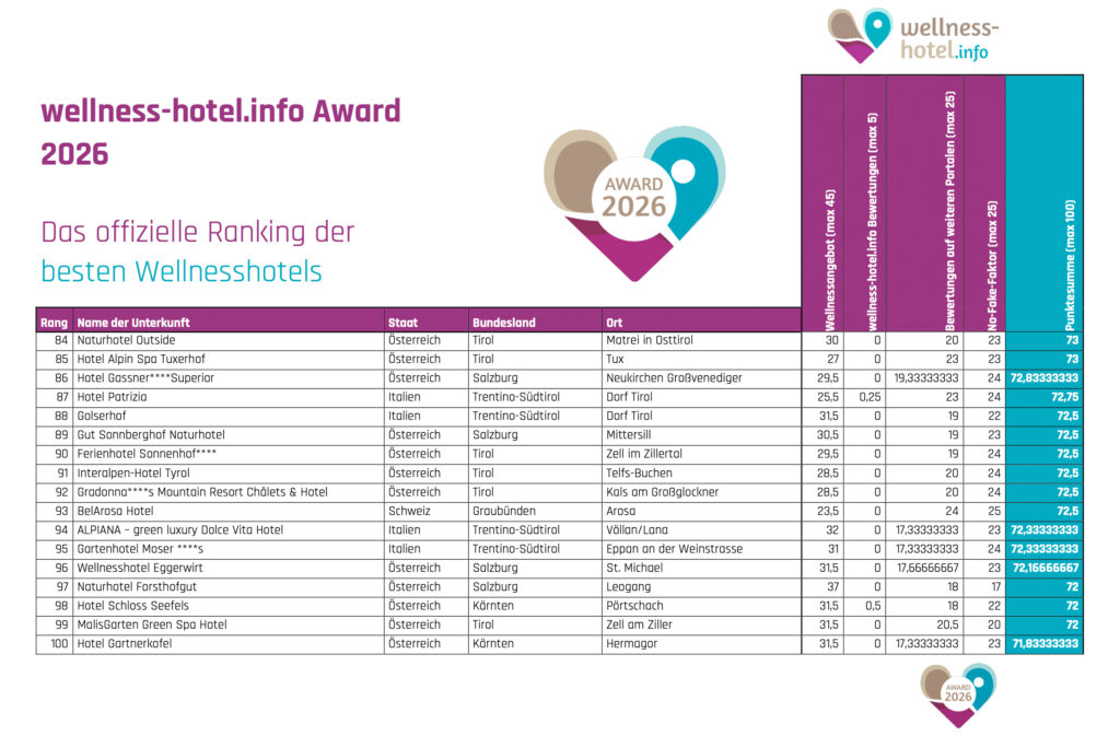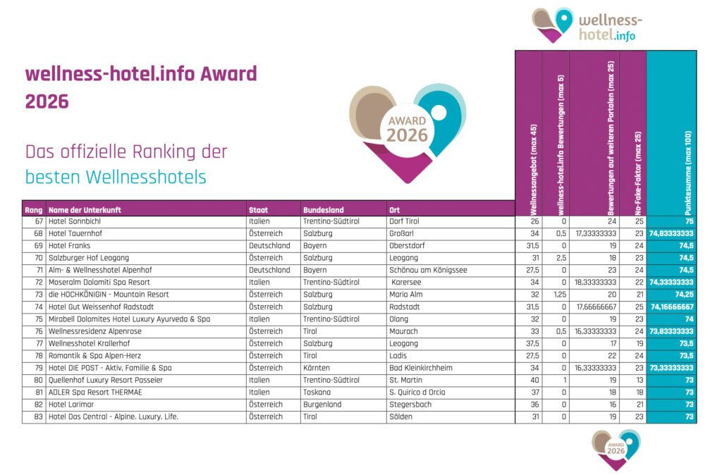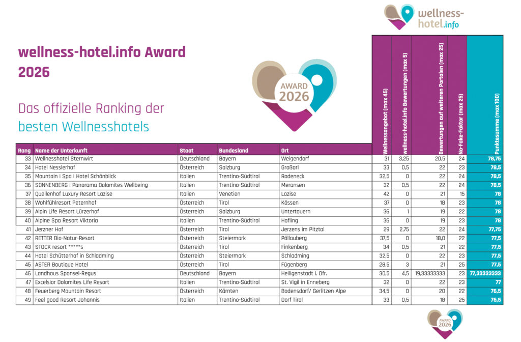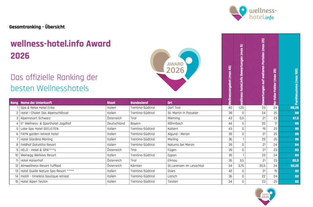 Zum fünften Mal kürt das aktuelle Ranking von wellness-hotel.info aus einer Auswahl von mehr als 1.600 Wellnesshotels die Spitzenbetriebe aus Deutschland, Österreich, Südtirol und der Schweiz. Dabei kommt ein eigens entwickeltes Bewertungsverfahren zum Einsatz, mit dem Ausstattung sowie Gästezufriedenheit aller Hotels analysiert und ausgewertet wird.