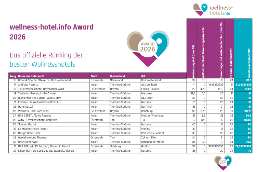 „Perfekt inszenierte Bilder genügen nicht – die besten Wellnesshotels überzeugen mit ehrlicher Qualität und beständiger Gästezufriedenheit. Unser Award liefert eine objektive und transparente Antwort. Für 2026 wurde er erstmals auf 100 Plätze erweitert, um einen umfassenden Branchenkompass zu schaffen. Er hebt jene Hotels hervor, die ihren Gästen nachhaltig hervorragende Wellnesserlebnisse bieten. Dies erreichen wir durch einen sorgfältigen Vergleich der Ausstattungen und Angebote sowie eine präzise Analyse der Gästezufriedenheit”, betont Christoph Reichl, Redaktionsleiter bei wellness-hotel.info.
