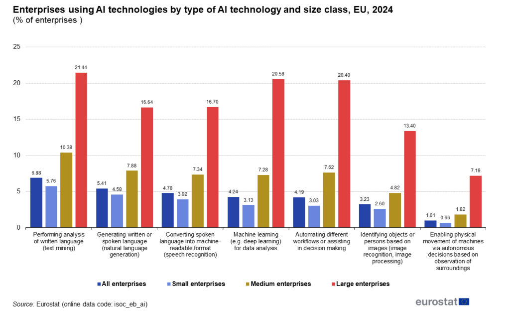 Eurostat-Daten aus dem Jahr 2024 machen den Handlungsbedarf sichtbar: EU-weit setzten nur 13,5 Prozent aller Unternehmen mit mindestens zehn Mitarbeitenden KI-Technologien ein, ein Plus von 5,5 Prozentpunkten gegenüber 2023.