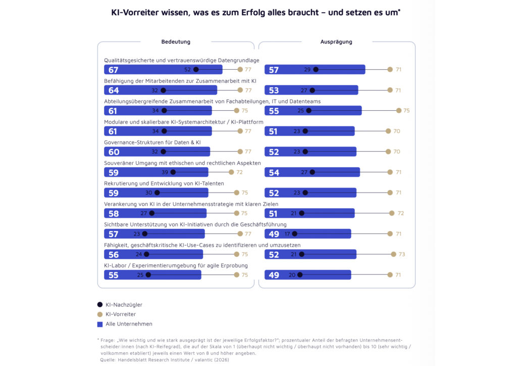 Ebenso bewerten Vorreiter die Relevanz einzelner Erfolgsfaktoren beim KI-Einsatz anders als die Nachzügler. Während sowohl Vorreiter als auch Nachzügler eine qualitätsgesicherte Datengrundlage als erfolgskritisch für KI-Anwendungen erachten, messen Vorreiter Faktoren wie der abteilungsübergreifenden Zusammenarbeit zwischen Datenteams und Fachabteilungen, soliden Governance-Strukturen oder der Befähigung der Mitarbeitenden eine deutlich höhere Bedeutung bei, als dies die Nachzügler tun.