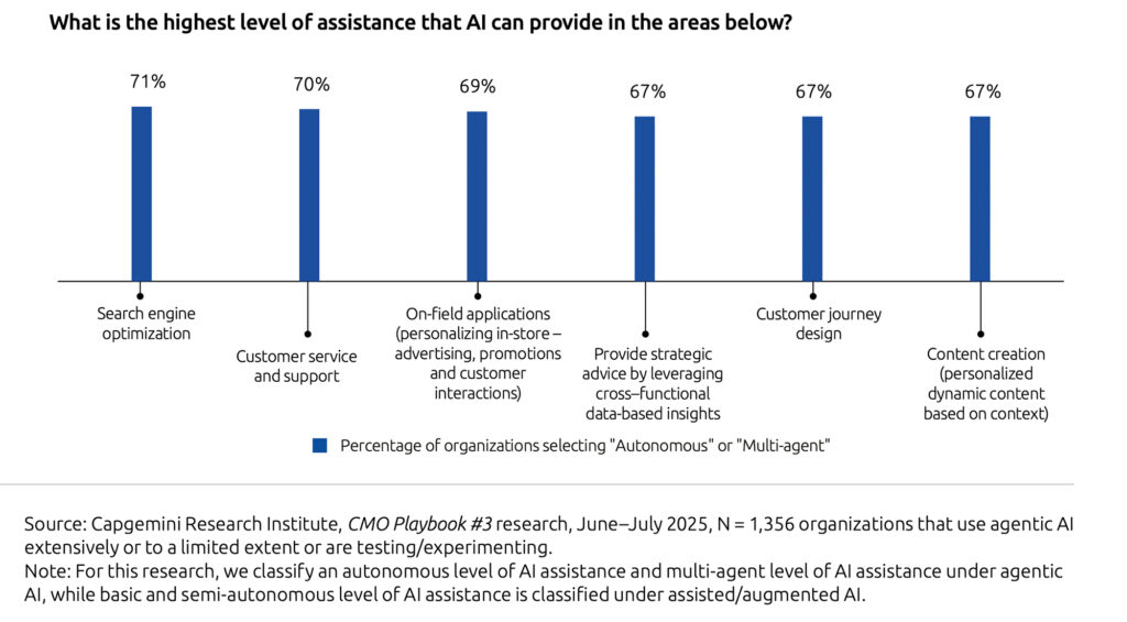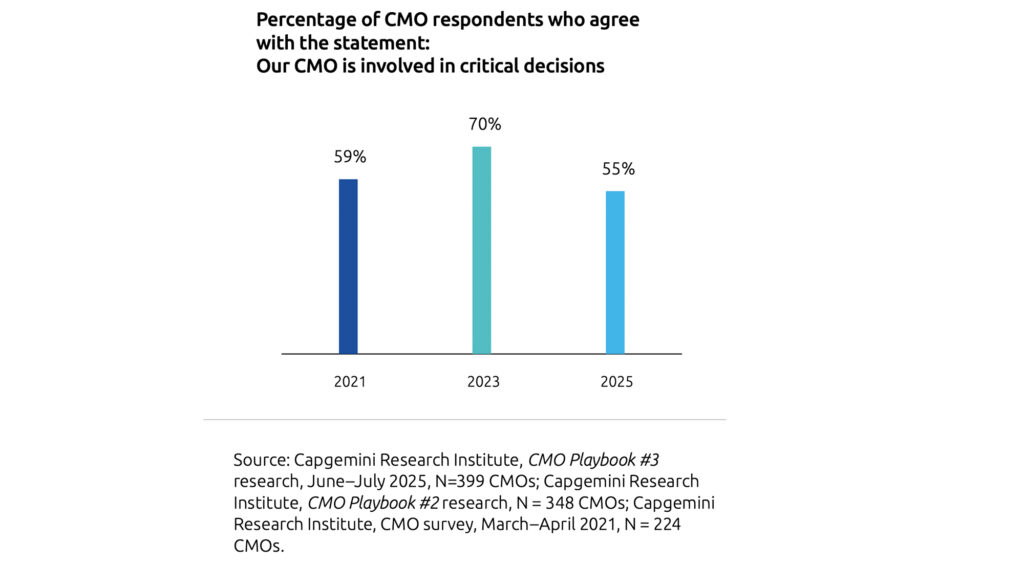 Gleichzeitig ist der Anteil der CMOs, die an wichtigen Entscheidungen beteiligt sind, in den letzten zwei Jahren von 70 Prozent auf 55 Prozent gesunken. Obwohl generative KI (Gen AI) im Marketing immer stärker genutzt wird – etwa für Content-Erstellung, Kundensegmentierung und digitale Kampagnen – geben weltweit nur 15 Prozent der Marketingverantwortlichen an, dass Routineaufgaben in ihrem Bereich automatisiert sind.