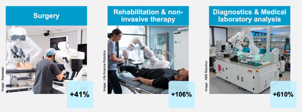 Der Absatz von Medizinrobotern stieg im Jahr 2024 sehr deutlich um 91 % auf rund 16.700 Einheiten. Der Absatz von Rehabilitations- und nicht-invasiven Therapierobotern stieg um 106 %. Die Nachfrage nach Operationsrobotern wuchs um 41 % und der Absatz von Robotern für die Diagnostik und medizinische Laboranalyse um 610 %.