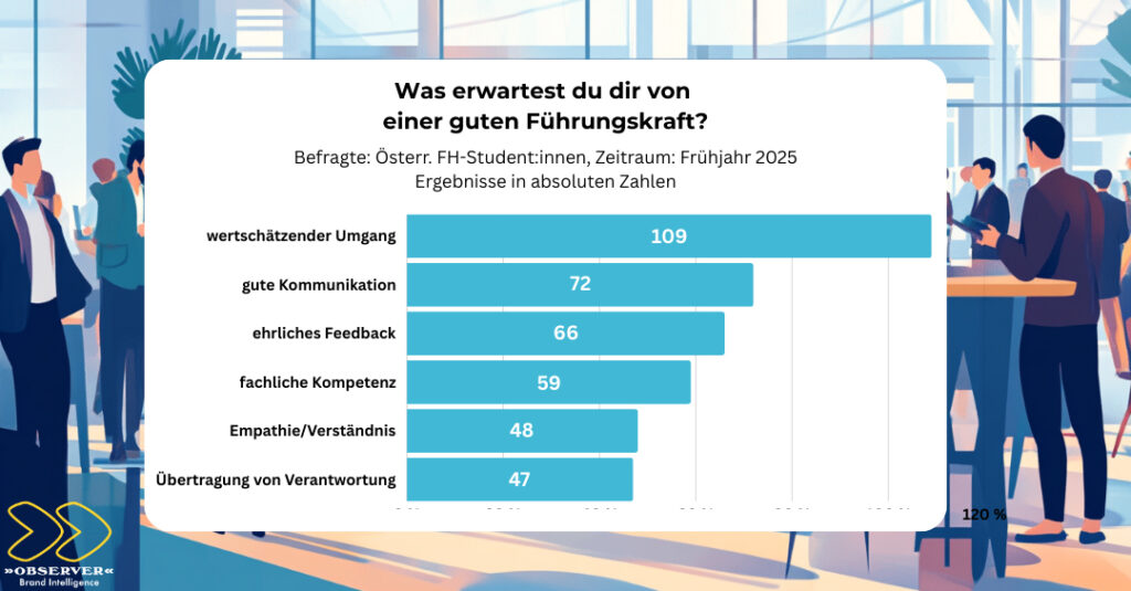 71 % achten bei der Auswahl des Jobs stark auf die Werte des Unternehmens. Von einer guten Führungskraft werden vor allem ein wertschätzender und respektvoller Umgang (109 Stimmen) erwartet, gefolgt von einer guten Kommunikation (72), einem ehrlichen und offenen Feedback (66), fachlicher Kompetenz (59) sowie Empathie und Verständnis (48).